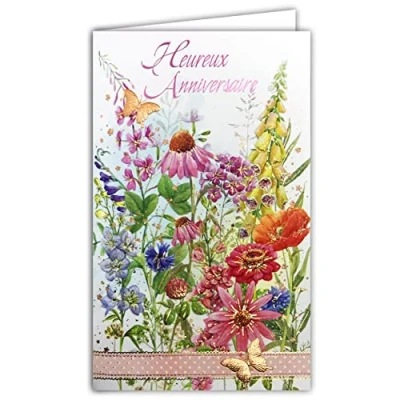 Afie 15 6465 ARGUS Embossed Illustrated Card with White Envelope 12 x 19.5 cm Happy Birthday Pink and Gold Shiny Wild Flowers Country Butterflies Ribbon Polka Dot Embossing Paper
