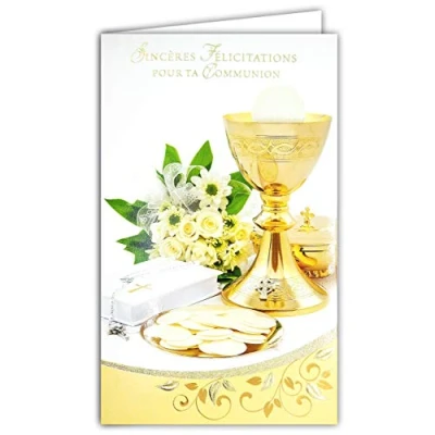 Afie 19 631 Holder Card with Envelope Congratulations for Your Communion in Gold Shiny Copper Osties Cut Catholic Cross Bible Rosary White Flowers Party Spring