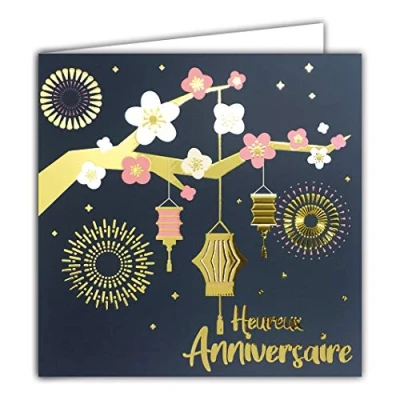 Afie 22062 Square Card Happy Birthday Gold Shiny Japanese Cherry Blossom Lanterns Fireworks Chinese Asian Party of Lights