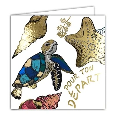 Afie 22091 Square Card with Envelope 15 x cm for Start in Gold Shiny Starfish Turtle Textured Relief to Gift Coworkers, Friends or Retired Related Made France