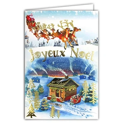Afie 61 5673 Merry Christmas Card with Envelope and Gilding in Shiny Gold Sparkling Sleigh Reindeer Santa Claus Distribution Gifts for Smoking Fireplace House Under Snow Trees