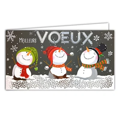 Afie 61 5702 Panoramic Card Best Greetings Shiny Silver Sparkling Snowman Hat Ponpom Scarf Flakes Horizontal End of Year Parties with White Envelope