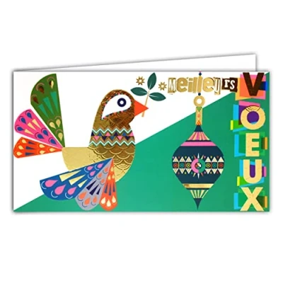 Afie 61 5703 Best Greetings Panoramic Card in Gold Sparkle Glitter Flamboyant Bird Dove Peace Ball End of Year Horizontal with White Envelope