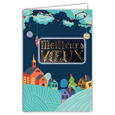 Afie 61 6018 Card with Envelope and Collage in Gold Shiny Text Wish a Happy New Year Present Your Best Wishes Village Under the Snow Church Tree Baubles Garland