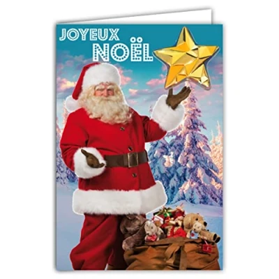 Afie 61 6034 Merry Christmas Card with Envelope and Collage Embossed Gold Star Glitter Sparkling Santa Photo Costume Red Beard Hood Gifts Toys Plush Animals Forest