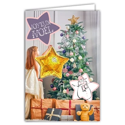 Afie 61 6045 Merry Christmas Card with Envelope and Collage Embossed Gold Star Balloon in Shiny Sparkling Glitter Decorating Tree Balls Gifts Teddy Bear Snowman Little Girl