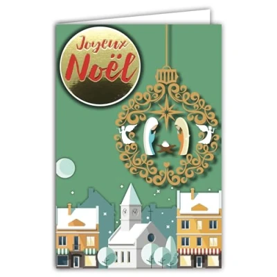 Afie 61 6048 Merry Christmas Card with Envelope and Collage in Relief Nativity Scene a Shiny Gold Ball Sparkling Jesus Mary Joseph Angels Star Shepherd Church City Mess Eve