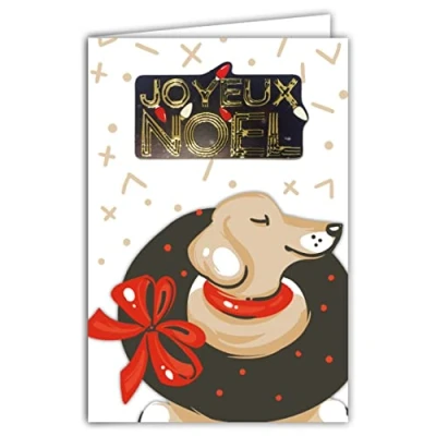 Afie 61 6055 Merry Christmas Card with Envelope and Collage Embossed in Gold Shiny Sparkling Glitter Dog Collar Wreath Bow Red Ribbon Holiday End of Year