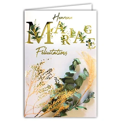 Afie 63 1150 Happy Wedding Card in Shiny Gold with Envelope Made France Bohemian Chic Dried Flowers Eucalyptus Gramine