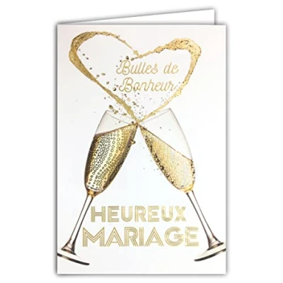 Afie 63 1155 Happy Wedding Congratulations Card with 2 Champagne Flutes Heart of Happiness Bubbles in Gold Shiny Sparkly Chic Envelope Included Made France