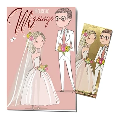 Afie 63 1157 Happy Wedding Card with Bookmark in Shiny Gold Illustrated Bride and Groom Flowers Boho Chic Soft Pink Envelope Included Made France