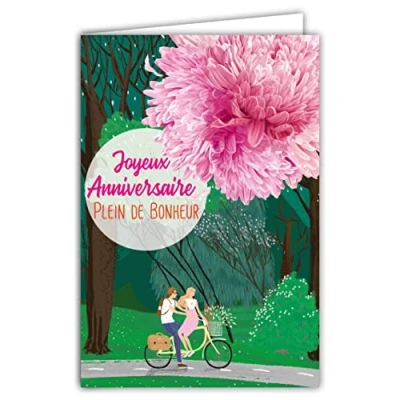 Afie 65 1334 Happy Birthday Card Full of Happiness for Young Girl Woman Lover Illustration Bicycle Pink Flower Peony Forest Envelope Included Made in France