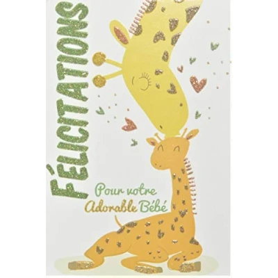 66-1159 Card with Glitter Congratulations to Parents Welcome Baby Boy Daughter Dad Mum Giraffe Animals Cute Hearts Made in France