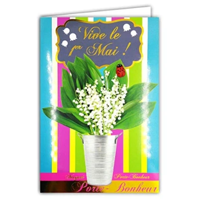Afie 68 1046 B Lucky Card with Yellow Envelope Lily of The Valley Wooden Ladybird Hand Painted 1st May in Gold Shiny 13 White Bells Bouquet Flowers Party Spring
