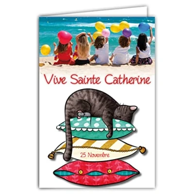 Afie 68 1308 Card with Envelope Vive Saint Catherine 25 November Bonne Fête for Little Girl Who Love Cats Balloons Cushions Sand Sea Trading Friends Recreation