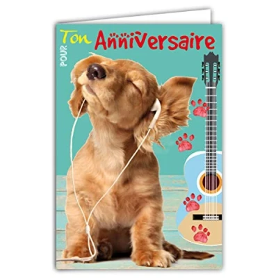 Afie Card for Your Birthday Dog Puppy Labrador Retriever Cute Earphones Music Guitar Paws Made in France