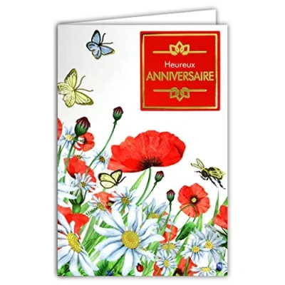Afie Happy Birthday Card Bouquet Red Daisy Flowers Poppies Butterflies with Gold Gilding Made in France