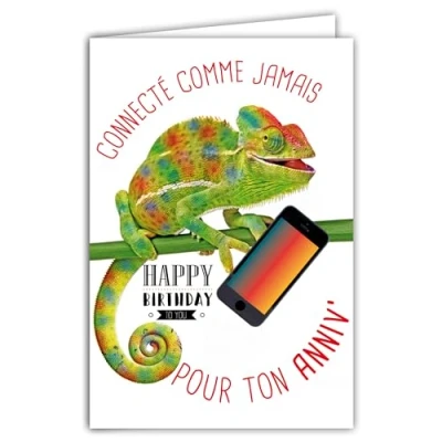 AFIE Humorous Happy Birthday Card with Illustrated Envelope 17.5 x 12 cm Chameleon Funny Smiling a Connected Smartphone Design Made in France 69 6213