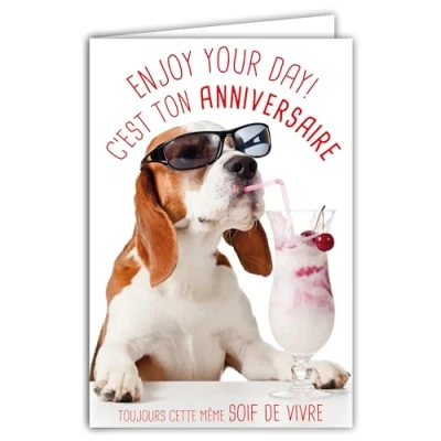 AFIE Humorous Happy Birthday Card with Illustrated Envelope 17.5 x 12 cm Funny Dog Sunglasses and Ice Cream Cherries Design 69 6208