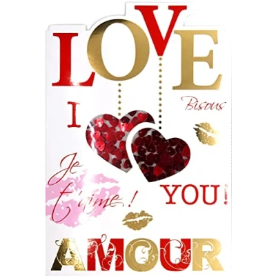 Afie I Love You Card 2 Red Hearts Pearls Rhinestone Kisses Lips in Shiny Gold Heart Half Feelings Declare Her Flame Valentine's Day 14th February with Pink Envelope 65 1125 A