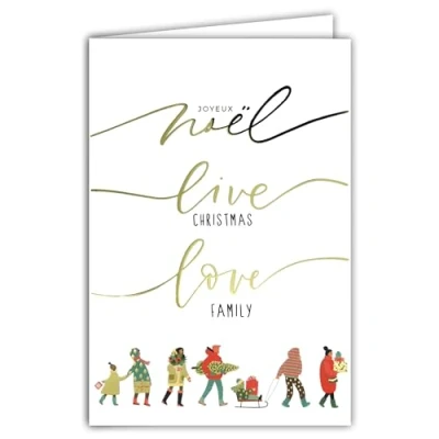 AFIE Merry Christmas Live Love Family Card in Shiny Gold Glitter with White Envelope Size 12 x 17.5 cm Illustration Loops Sledge Tree Winter Best Wishes Made France