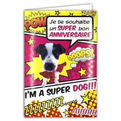 AFIE Pink Card Happy Birthday Super Hero Dog Puppy Bow Tie Onomatopoeia Bubble Comic Book with White Envelope 12x17.5cm67 1031 2