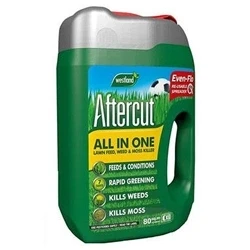 Westland Aftercut All In One Lawn Feed, 80 m², 2.8 kg This product will green and feed your lawn grass whilst killing moss and weeds This pack features a built-in even-flo applicator to ensure even and correct coverage with ease Kills Moss and Weeds including Common Dandelions, Daisys, White Clover, Creeping Buttercup and more Conditions and nourishes your lawn to improve its overall health and aid the lawn in outcompeting moss and weeds Children and Pets need not be excluded from the treated area once the treatment has been watered in thoroughly and the area has dried This pack will cover 80m² (the equivalent of 8 car parking spaces)