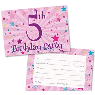Age 5 Party Invitations Kids. Pack of 36. Pink Starburst themed invitation with matching envelopes. 120 x 172mm. Invites, Birthday Invitations. Designed and Printed in UK.