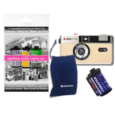 AgfaPhoto Analogue 35 mm Photo Camera in Complete Set: Film + Battery Development Kit for up to 36 Black/White/Images (by Post)
