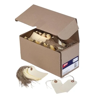 100 x 51 mm American labels made from 160gsm cream card with reinforced eyelet. Box containing 1000 tags + string included, ready to use Surface compatible with pencil, pen, felt-tip pen, gel ink, permanent marker and stamp. Ideal for product labeling, auto parts, storage, pressing, gifts, weddings, scrapbooks, crafts STYLISH AND FUNCTIONAL DESIGN - Cream color and metal eyelet for a neat finish