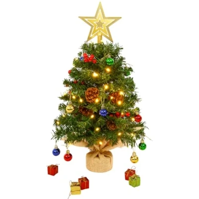 AGM 2ft Mini Christmas Tree, 60cm Tabletop Tree with String Light Topper Star Xmas Baubles and Boxes for Home Kitchen Dining Table Decor