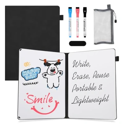 UPGRADE PU COVER: AGM Mini Whiteboard designed with a soft PU cover, offers a smooth, comfortable touch while ensuring a stable writing surface for everyday use. Ideal for office, study, travel, or daily reminders—boosting productivity anywhere DOUBLE-SIDED FOR MORE WRITING SPACE: This mini whiteboard features a book-style desig, which means you could use both sides to maximize writing area for detailed notes, planning, and brainstorming. It's very suitable for both office and study use LIGHTWEIGHT AND PORTABLE WHITEBOARD: Weighing just 0.85lbs, this A4-sized writing board is compact and easy to carry. Its slim design fits seamlessly into bags or backpacks, making it an ideal choice for work, study, or travel without adding unnecessary bulk All-IN-ONE WRITING SET: Comes with three color markers for better organization and a dry eraser for effortless corrections. The eraser features a reusable adhesive backing for easy attachment and removal MULTI-FUNCITONAL MESH POUCH: 8.15inchx 4.65inch size mesh bag keeps your essentials within reach. It could store not only stationery like pens and markers but also everyday essentials such as keys, cards, change, or small cosmetics. Its spacious design keeps everything organized and easily accessible, portable for on-the-go use