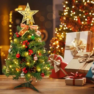 COMPACT GREEN CHRISTMAS TREE: At 2ft tall, this mini PVC tree is a great fit for smaller spaces such as desks, tabletops, or shelves, delivering festive cheer without taking too much of your space PRE-DECORATED MINI TREE: In addition to the natural pinecones and red berries, this tabletop Christmas tree includes 20 mini Christmas baubles and a tree topper star, creating a clean and minimal holiday look WARM LED LIGHTING: The 5M 50LED warm white string light (batteries not included) adds a gentle glow, creating a cozy, festive atmosphere wherever you place it STABLE BASE: The sturdy cement base, wrapped in red fabric, ensures your tree stays upright while adding a festive, decorative touch to the overall appearance EASY SETUP AND STORAGE: Designed for quick setup and easy storage, this mini Christmas tree lets you effortlessly bring holiday cheer into your space, year after year