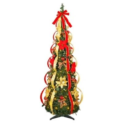 QUICK POP-UP SETUP: Assembles in minutes with its pop-up design—just unfold and secure for an instant festive display. The collapsible frame allows easy setup, movement, and compact storage after the holidays PRE-LIT WITH WARM WHITE LED: Features a 20m string of 200 evenly spaced LED lights that emit a warm, cozy glow. Perfect for brightening up your living room, hallway, or party setting PRE-DECORATED FOR INSTANT DISPLAY: Comes pre-decorated with a large bow topper, 6 ribbons (3 gold, 3 red), 24 ornaments, 18 small bows, and 15 poinsettia flowers. No extra decorating needed, just pop it up and enjoy CLASSIC RED AND GLOD STYLE: A timeless blend of red and gold ornaments brings elegance and warmth to any festive scene, creating a rich and traditional Christmas look for your indoor décor SPACE-SAVING ARTIFICIAL TREE: A full 6FT Christmas tree that collapses flat for easy storage. Ideal for smaller spaces or quick seasonal decorating, offering a simple way to enjoy the beauty of a traditional tree