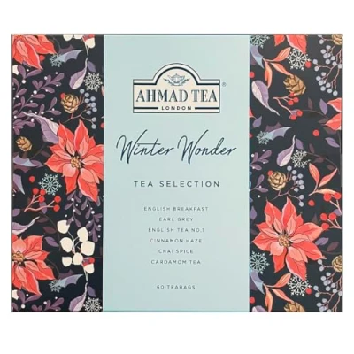 Ahmad Tea Christmas Selection Pack 60 Teabags English Breakfast, Earl Grey, Cinnamon Haze, Chai Spice, No.1, Cardamom Festive Gift Box from Winter Wonderland Collection