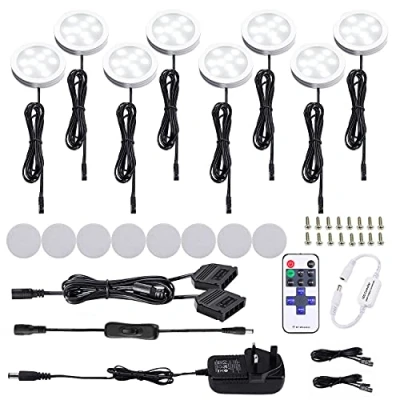 【DIMMABLE UNDER CABINET LIGHTING 8 Pack】These under cabinet lights are adjustable dimming mode kits.The dimming function from 0 to 100% can be adjusted the lighting brightness.Adjust the 6000K crisp white light to suit any task, from prepping meals to creating a cozy atmosphere.Under cupboard lights ensure that everyone can work in the lighting conditions they prefer best. 【LOW PROFILE & INVISIBLE】The dimension of the slim puck light is: Diameter: 2.3 inch, Thickness: 0.31 inch.Kitchen unit lighting comes to aesthetics after installation, ensuring they do not stick out unattractively from under the cabinet.LED under cabinet lighting can blend seamlessly into dark shelves and cabinets,allowing focus on your displayed items while remaining practically invisible. 【RF WIRELESS CONTROL】Coming with a RF remote control,our under cupboard counter shelf lights will be more convenient when you are controlling it.Signals can get through the cabinet or wall without pointing to the receiver.These under counter lights for kitchen are perfect for brightening countertops or illuminating shelves.And it remembers the last setting used when you turn it on again. 【EASY TO INSTALL】All accessories are provided for simple installation.You can use the included double sided tape to attach the LED closet lights to the underside of you want with no drilling.And these dimmable under cupboard kitchen lights are super slim so they don’t hang down.These bookcase lights come with plus a central hub with generous cord length, allowing flexible placement in multi-shelf setups. 【WIDE APPLICATION】 This kind of under cupboard lighting can be used as Decorative lights for your kitchen cabinet,counter and showcase.In addition, it also can be use as to bookshelf light. It will be a desk lamp when you are studying or working.Suit for kitchen, bedroom, cabinet, closet, wardrobe, workspacea, counter, desk, display, showcase, workshop, garage, stairs, hallway, storage room etc.