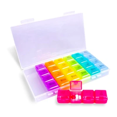 7-day pill box with 4 compartments per day Each compartment labeled morning, noon, evening, and bedtime Perfect for those who take multiple medications throughout the day Compact and easy to carry, great for travel Easy to clean and maintain - BPA free