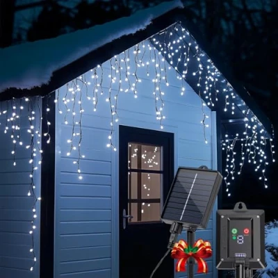 8 Dynamic Lighting Modes with Smart Memory: These hanging string lights transform spaces with Combination, Waves, Sequential, Slow Glow, Chasing, Slow Fade, Twinkle, and Steady On effects. One-touch switching via adapter button. Memory function always remember your last setting – no resetting each time you turn on! (Ideal for hassle-free holiday decorating). IP65 Waterproof Christmas Icicle Lights outdoor: Rain/snow-proof ideal for outdoor gardens, roofs, gutters, balconies, gazebos and Xmas trees, allowing you to extend the Christmas spirit to your exterior decor. Create magical atmospheres for Christmas, Halloween, weddings, and parties without worrying about damage. 5M Classic Wavy Icicle Effect String Light+ 3M Power Cord: 100 ultra-bright cool white LEDs mimic shimmering ice cascades. Features mixed-length LED drops (up to 60cm) that create a natural, cascading icicle look, just like real melting ice. 8-meter total coverage (5M Length lights *0.6M Height + 3M cable) easily drapes high eaves or wraps trees. Perfect length Aigostar cool white fairy light! Up to 12 Hours of Auto Night Illumination: Experience effortless lighting with our high-efficiency solar panel and integrated 1200mAh battery. After just 4-6 hours in sunlight, these solar curtain lights provide up to 12 hours of cool, ambient light. The built-in dusk-to-dawn sensor automatically turns the outdoor fairy lights on at sunset and off at sunrise, saving you energy and effort. Effortless Setup for Instant Holiday Magic: Enjoy a hassle-free installation with no outlets or cords needed! The 5M lead wire and separate solar panel offer flexible placement. Simply secure the LED string lights along your desired area and position the panel in a sunny spot. A convenient ON/OFF switch on the panel gives you full control, ensuring easy operation and efficient charging for your wedding and party decorations.