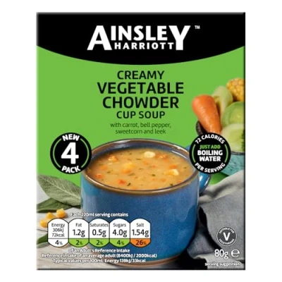 Deliciously creamy vegetable chowder cup soup with carrot, bell pepper sweetcorn and leek just hot water and enjoy Ainsley Harriott Cup soup flavours are inspired by recipes from all over the world from our Spicy Szechuan Tomato to our Creamy Vegetable Chowder there’s a favourite flavour for everyone Prefect for those that are looking for a tasty, satisfying snack or a light lunch After almost three decades as one of the country’s favourite TV chefs Ainsley Harriott has become something of a national institution He has become the master of fresh fun accessible cuisine CONVENIENT This pack contains 8 x 80g servings offering a quick easy and delicious soup that’s ideal for busy lunches or a tasty snack any time of the day