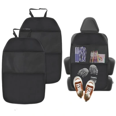 [UNIVERSAL SIZE]: 65 x 44 cm, Our protective car seat covers fit most car seats - sedans, 4-door sedans, Jeeps, SUVs and more [EASY TO CLEAN]: Our car kick mats are made of high quality polyester fiber with PVC coating, waterproof and dirt resistant, just wipe clean with a damp cloth. No need to worry about kids and pets getting dirty car seats [PERFECT DESIGN]: The anti-kick mats have adjustable buckles at the top and elastic straps at the bottom, which ensures that the protective mats fit perfectly on the backrest of the car seat, very beautiful [EASY TO USE]: Simply hang the car seat protector on the headrest and secure it under the seat with the adjustable elastic band at the bottom [LARGE STORAGE POCKETS]: Our anti-kick mats also add two large storage mesh pockets to hold pocketed products and effectively organize your cabin clutter