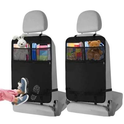CHILD CAR SEAT PROTECTOR - The back seat protector has two handy mesh pockets and a large zippered pocket to keep all toys safe. Keep children happy on the road and keep your car clean and tidy. Easy to clean: the car seat holder is made of Oxford fabric, nylon (mesh pocket), waterproof and easy to clean, dirt can be easily wiped off with a damp cloth, can protect front seats from scratches, dirt and wear, ideal for those who have children and pets! EASY INSTALLATION Simply attach the click fastener to the headrest, then the middle click closure, and then the two metal hooks under the seat. Compatible with most cars: the car seat organiser is 45 x 65 cm. Compatible with 99% of cars, trucks, SUVs and other models. Car back seat organiser ensures fully protected seats in your car keep space organised for long travel time. Protection for your car seats: the spacious backrest protector with built-in compartments protects the entire front seat from dirt and damage and ensures peace of mind when driving.