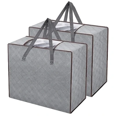 Large capacity: the size of a single storage bag is 60 x 50 x 30 cm and the capacity is 90 litres. to hold 6-8 kg clothes and meet all your storage needs. There is enough space for a duvet, blanket, pillow, toys, jacket or other garments. High-quality material and foldable: large storage bag is made of three-layer non-woven fabric, which is environmentally friendly and durable, effectively tear-resistant, moisture-resistant, breathable, tasteless. There are no metal brackets inside the storage and it can be easily folded into a drawer or cabinet to save space. Internal visibility: the front of the clothes storage organiser is equipped with a large transparent viewing window, and several storage pockets for duvets are stored in the same place, so you can clearly see where the clothes are located and easy to find you need. Durability: The handle on the storage bag clothing side is double stitched, with double load capacity. Easy to take and stack. Two-way zipper design, no matter how full the bag is, the two-way zipper can slide easily. Clothes storage can be placed in the cabinet, cupboard or under the bed, suitable for dormitories, attics, basement and bedrooms. Multifunctional: large storage bag can not only store quilts, blankets and bedding, but also helps you cope better with a move and store more items at once, saving you more heartache.