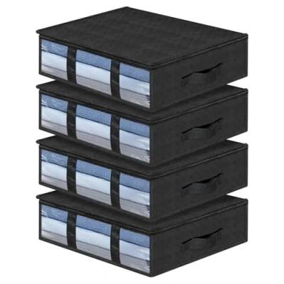 Breathable & Eco-Friendly Fabric:Our underbed storage bins are made of 100% non-woven fabric, which allows air to circulate inside and keep stored items fresher for longer. The underbed storage box is durable, breathable and waterproof and protects stored items from moisture and dust, preventing the growth of bacteria and odours inside the container. Foldable & Spacious Underbed Storage - The product includes 4 underbed storage bins, Size:(60x45x15cm) Ideal for storing bedding, sheets, seasonal clothes and other household items. You can fold it up to save space when not in use. STURDY CARRY HANDLES & ZIPPERS: The underbed storage box has 4 reinforced carrying handles on the front and sides for easy transportation and handling, and can also be easily pulled out from under the bed. The under bed storage box is equipped with high quality 5# stainless steel two-way zippers and durability for long term use, more durable and less likely to break or tear. Transparent Window Design:The under bed storage box with transparent window allows you to see at a glance what's inside through the "window". So you can quickly find the clothes or bedding you need. Save time searching. The storage box under the bed is not easy to tear and can be reused several times, making daily life more efficient. MULTIPURPOSE UNDERBED STORAGE CONTAINER - Foldable underbed storage box can hold sheets, quilts, blankets, pillows, clothes, toys and other household items. Ideal for use in dormitories, closets, bedrooms, under bed, etc.