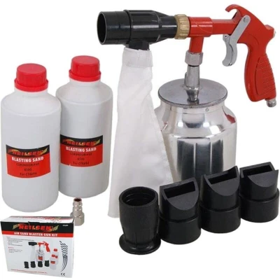 General description Neilsen Air Shot Sand Blaster is an efficient sandblasting kit designed for various applications, particularly in automotive bodywork and on all metallic surfaces. It effectively removes rust, dirt, and coatings, making it a versatile tool for DIY enthusiasts and professionals alike. The kit is compatible with normal corundum with a grain size ranging from 46 to 100, and it promotes lower consumption by allowing the reuse of the blasting material. Technical specifications Working pressure: 6 - 8 Bar (90 - 116 PSI) Maximum pressure: 8 Bar (116 PSI) Average air consumption: 6.5 cfm Recommended hose diameter: 9 mm (i.d.) Includes 2 bottles with 850g of grit, corundum #60 Compatibility and accessories Sand blasting cap for surfaces Sand blasting cap for inside corners Sand blasting cap for outside corners Sand blasting spot cap
