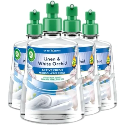 24/7 Active Fresh Autospray effortlessly tackles odours with aerosol free fragrance Imagine the clean scent of just-washed linen with notes of white orchid, orange blossom, and a whisper of citrus to bring a delightful freshness Infused with 2x more essential oils* (*vs existing Air Wick Active Fresh Autospray Refills) Recyclable Bottle, made from 50% PCR Tackles odours with amazing fragrance for up to 70 days* (*based on lowest setting)