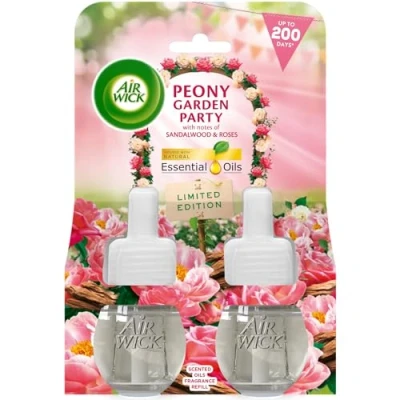 Enjoy Air Wick plug in scented oils infused with natural essential oils with our range of fragrances lasting up to 200 days based on lowest setting Peony Garden Party 5x settings for your desired fragrance intensity. 2x19ml Naturally derived ingredients. Free from added Phthalates, acetone and dyes Plastic Free Pack. All Air Wick Scented Oil packs are plastic free