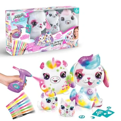 PERSONALISE YOUR CUTE PLUSHES: Each pack comes with a soft Puppy plush, a Unicorn squishy & 2 baby squishies! Decorate them in your own style with the fun airbrush & colourful chalk pens! CREATE DIFFERENT DESIGNS: Wash-off your designs easily with water and start again! Over 240 stencils included to use or design your plush free-hand. REAL AIRBRUSH: Includes a real battery operated airbrush & 8 assorted colour chalk marker pens. Spray, wash & repeat! Batteries required: 2 x AA (not included) Refill kit available for this item - Airbrush Plush Refill Kit 10 Pack (B0CVXZH7FC)., Manufacturer: Canal Toys