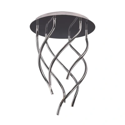 The Aire Ceiling Round 6 Light G4 in polished chrome features vertical arms that create a striking visual impact. This modern fixture is perfect for illuminating living spaces with a stylish and contemporary flair.