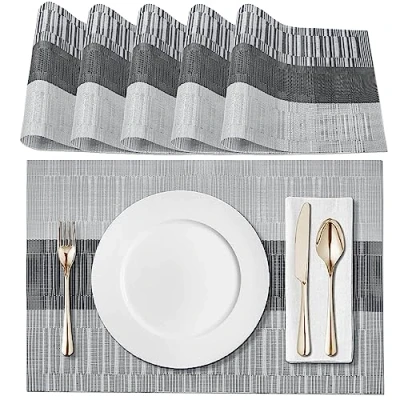Airymium Place Mats Non Slip Set of 6 Wipe Clean PVC Tear Resistant Heat for Kitchen Home Restaurant Dining Table CD G 002, 45 x 30 cm, Grey