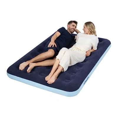 EFFORTLESS SETUP & PACK AWAY: Experience convenience with our airzzZ airbed, featuring a quick inflation and deflation system. Ideal for camping, hiking, or as an extra guest bed, making setup and storage a breeze. UNMATCHED COMFORT & DURABILITY: Crafted with a flocked top surface for a softer touch and vinyl coil beam construction for reliability, our inflatable mattress ensures a restful sleep wherever you are. WATERPROOF & SLIP-RESISTANT: The water-resistant flocked surface prevents sheets and sleeping bags from slipping off, providing a cozy sleep environment in any setting, indoors or outdoors. PUNCTURE RESISTANT WITH REPAIR KIT: Designed with durability in mind, our airbed is made from puncture-resistant PVC, accompanied by a robust puncture repair kit for peace of mind. PORTABLE & VERSATILE USE: Lightweight and easily foldable, the airzzZ air mattress is perfect for camping trips, guest use, or indoor sleepovers. Available in both single and double sizes to suit all your needs.